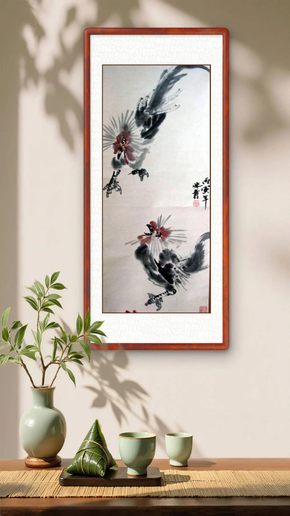 客厅(中式 / 吉祥风 ):挂客厅沙发墙或玄关,以公鸡的吉祥寓意与生动姿态,衬中式空间的喜庆氛围,添积极向上的活力,成家居吉祥文化与艺术品味的展示 。