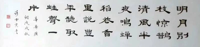 这幅作品是谢雪贵于戊戌年秋书写的南宋辛弃疾名词《西江月・夜行黄沙道中》。全文以隶书书写,字体古朴端庄,墨色浓淡相宜,既体现了隶书的雄浑厚重,又传递出词作中田园夏夜的清新与旷达,是 “以书入词、以笔传情” 的文人之作。