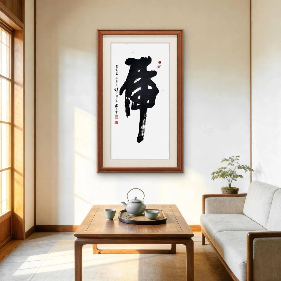 首选传统中式立轴装裱:选用深棕色或藏青色绫底,搭配红木大轴头,最大化凸显作品的雄威大气与传统质感;