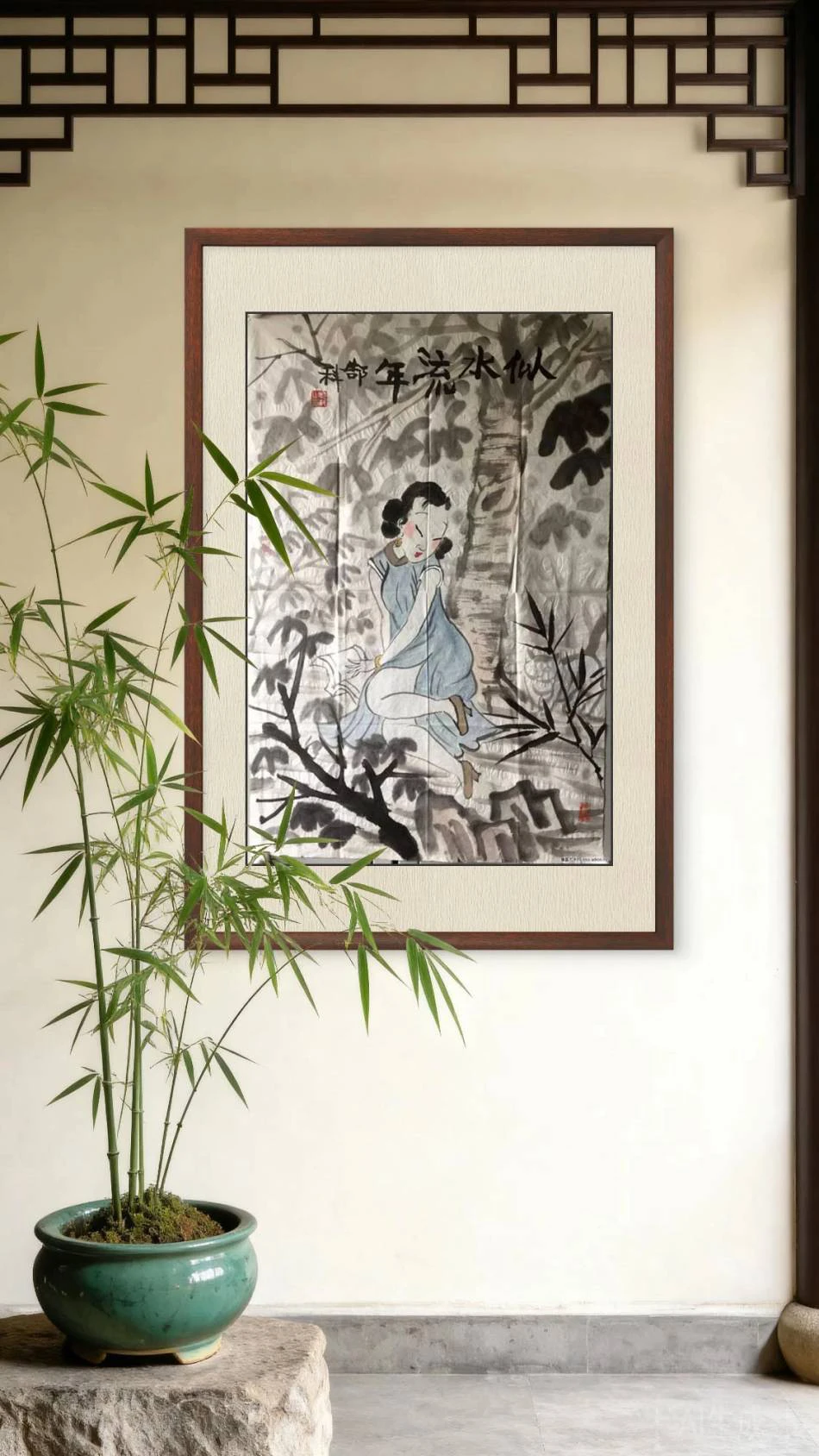 这幅《似水流年》是中国新文人画代表人物郜科的经典仕女题材代表作。作品以 “似水流年” 为核心主题,描绘了民国旗袍女子独坐林间、低眉凝思的瞬间,将时光流逝的怅惘诗意、民国时代的温婉风情,与传统文人画的清雅意趣完美融合。画面笔墨洒脱灵动,造型传神细腻,氛围感与故事感兼具,是郜科标志性民国风情人物画的典范之作。