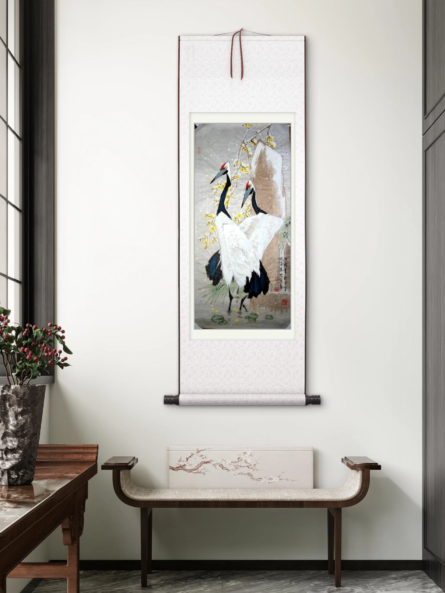 客厅 / 书房:装裱成立轴(传统卷轴样式),挂于客厅主墙或书房,以仙鹤腊梅的吉祥寓意和工写风格,营造 “福寿清雅、格调高贵” 的文化氛围,尤其适合追求传统吉祥与绘画艺术的空间;