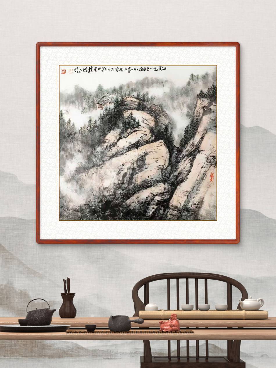 这幅国画借传统笔墨绘 “山居图” 山水景致,经装裱与场景适配,注艺术气质与文化深度,让观者于山水间,感受传统山水文化、隐逸生活美学与写意山水艺术的魅力 。