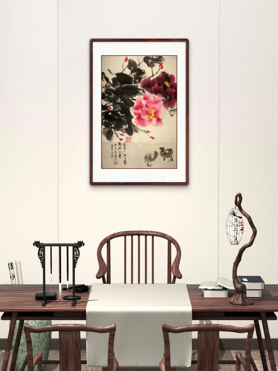 客厅 / 书房:装裱成立轴(传统卷轴样式),挂于客厅主墙或书房,以牡丹雏鸡的吉祥寓意和水墨风格,营造 “富贵吉祥、生机盎然” 的文化氛围,尤其适合追求传统吉祥与水墨艺术的空间;