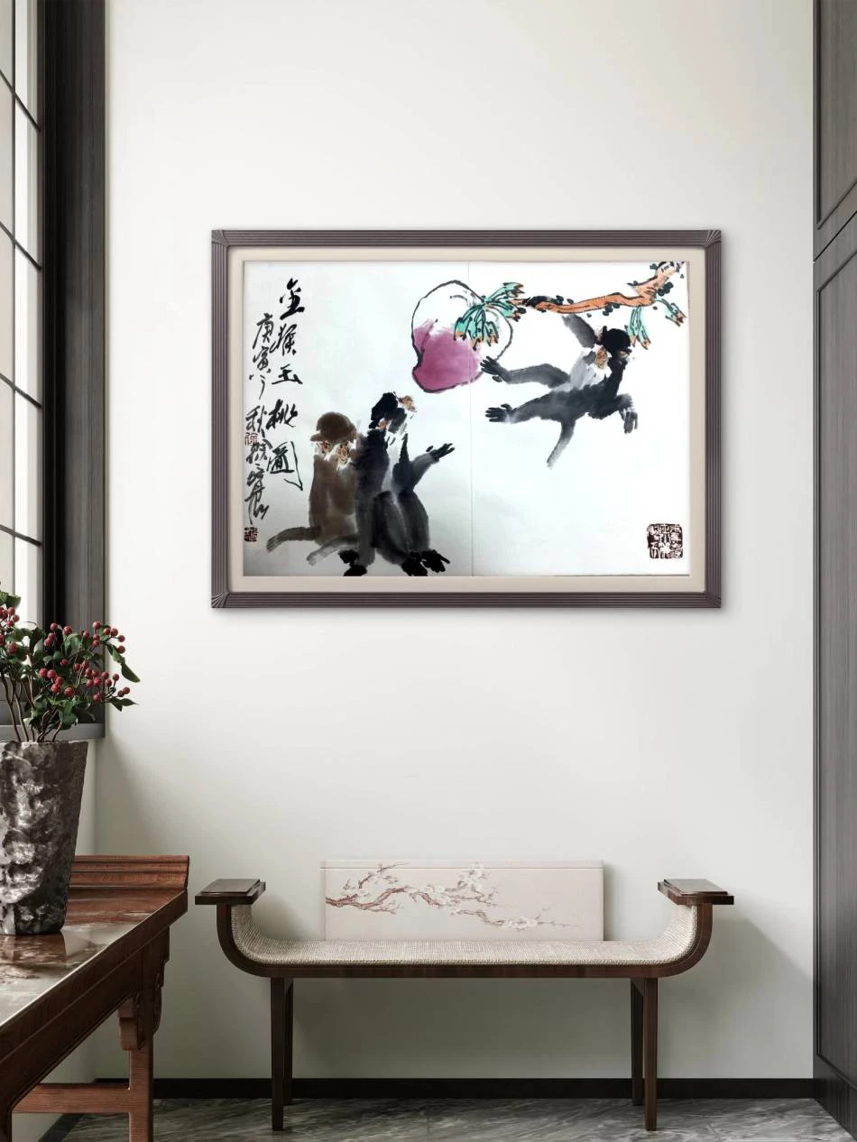 书房 / 客厅:装裱成小品镜框,挂于书桌旁或客厅雅致角落,以金猴玉桃的吉祥寓意和水墨风格,营造 “福寿吉祥、童趣盎然” 的文化氛围,尤其适合喜爱民俗吉祥与水墨艺术的空间;