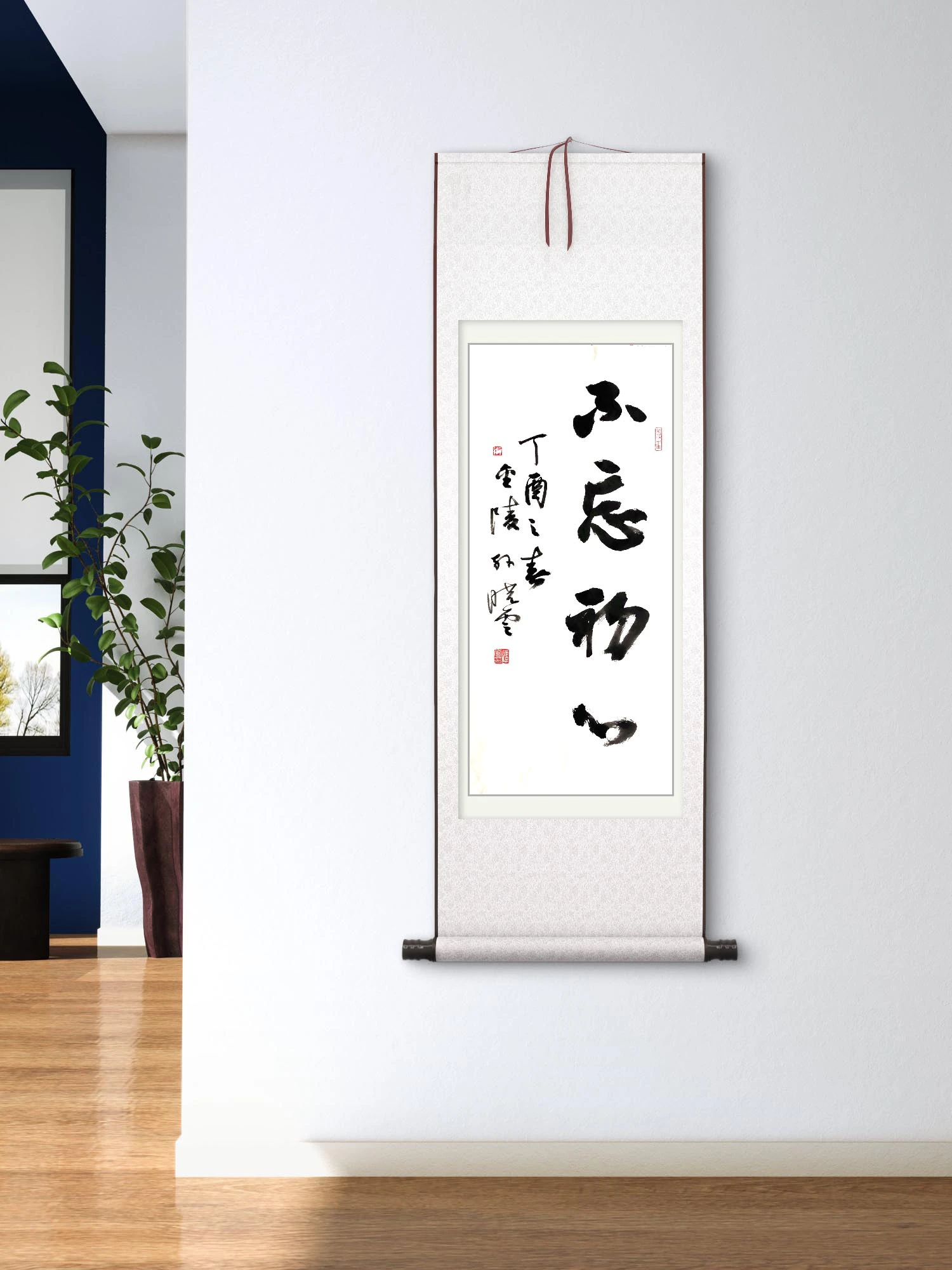 书房 / 办公室:装裱成立轴(传统卷轴样式),挂于书桌对面或办公室墙面,以 “不忘初心” 的内涵和行书的大气风格,传递 “坚守本真、砥砺前行” 的精神,提升空间的文化品位与精神格调;