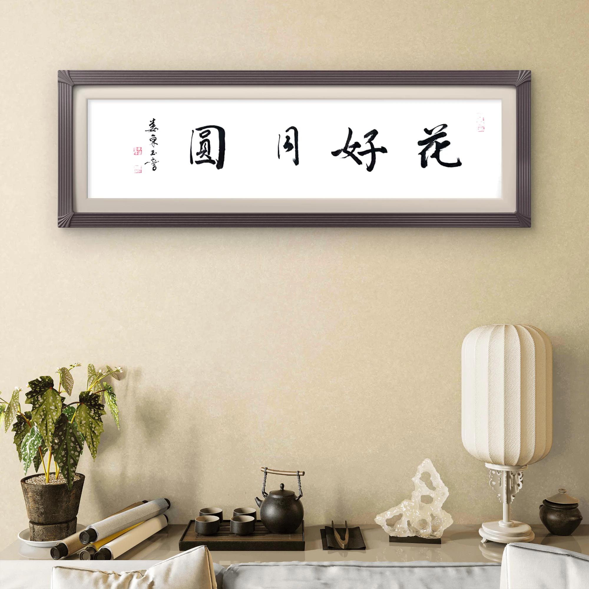家居客厅 / 卧室:装裱成横幅镜片(平板装裱),挂于客厅主墙或卧室,以 “花好月圆” 的吉祥寓意和行书的雅致风格,营造 “团圆美满、温馨雅致” 的家居氛围,尤其适合新婚、乔迁等喜庆场景;