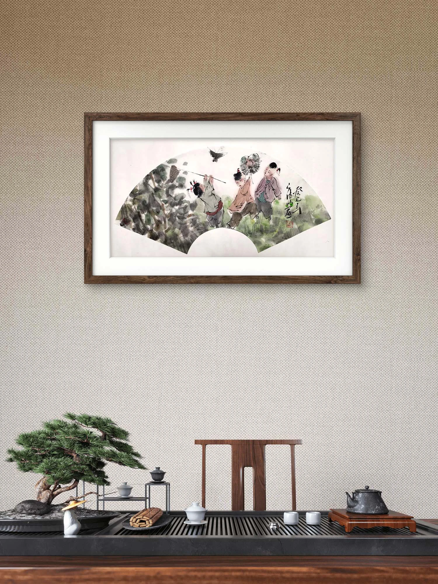 书房 / 客厅:装裱成扇面镜框,挂于书桌旁或客厅雅致角落,以童戏捕蝶的童趣寓意和水墨风格,营造 “童真灵动、意趣清雅” 的文化氛围,尤其适合喜爱民俗童趣与水墨艺术的空间;